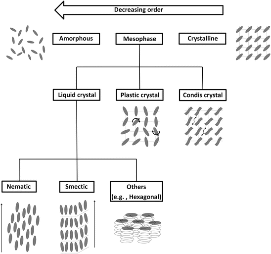 Poza trzema podstawowymi stanami skupienia wyróżnia się stany pośrednie. Stany pośrednie pomiędzy ciałem stałym a cieczą to ciekłe kryształy, kryształy plastyczne i kryształy condis. Ciekły kryształ to materia, która ma zdolność płynięcia (cecha cieczy – cząsteczki w obrębie objętości mogą się poruszać między sobą), ale cząsteczki zachowują dalekozasięgowe uporządkowanie (utrzymują pewien wzór i orientację). Ciekłe kryształy można przyrównać do napędu gąsienicowego, w którym człony gąsienicy są ze sobą połączone (uporządkowanie), ale zmieniają swoją pozycję względem innych elementów (ruchliwość) i nie są zdolne do utworzenia stabilnej struktury utrzymującej swój kształt (elastyczność). Istnieją różne rodzaje ciekłych kryształów. Cząsteczki w kryształach plastycznych mają zdolność zmiany orientacji (prawie swobodna rotacja dookoła miejsc równowagowych cząsteczek w obrębie swoich miejsc w sieci). Kryształ condis, to materia, której cząsteczki są długie i cienkie i formują równoległe względem siebie kolumny. Pod wpływem dużego ciśnienia substancja w tym stanie zaczyna płynąć, tak jak ciecz.