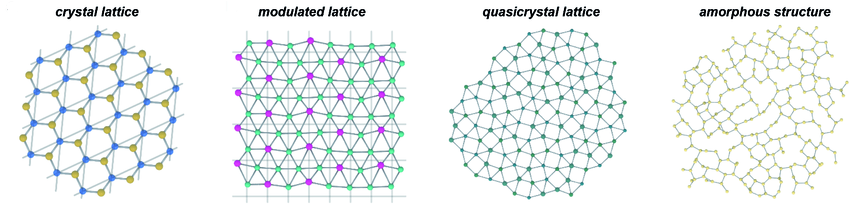 Cząsteczki w ciałach stałych mogą mieć różny stopień uporządkowania. Sieć krystaliczna charakteryzuje się uporządkowanym ułożeniem atomów i cząsteczek, a sieć amorficzna ich nieuporządkowaniem, pomimo silnych wiązań. Cząsteczki w strukturze krystalicznej przyjmują określone pozycje i orientacje, tworząc symetryczne i przestrzennie powtarzalne układy. Strukturę krystaliczną mają kryształy soli kuchennej (kryształy jonowe), minerały takie jak kwarc i diament, czy metale, takie jak miedź. Ciało stałe może składać się z jednego kryształu (monokryształ) lub z wielu kryształów (polikryształ). Sieć amorficzna (bezpostaciowa) to struktura, w której cząsteczki są ze sobą powiązane, ale nie ma w nich uporządkowania. Przykładem ciała amorficznego jest szkło. Sieć strukturalna ciała stałego może również stanowić pewną uporządkowaną, ale nieregularną formę. Wówczas takie ciało to kwazikryształ (niby-kryształ).